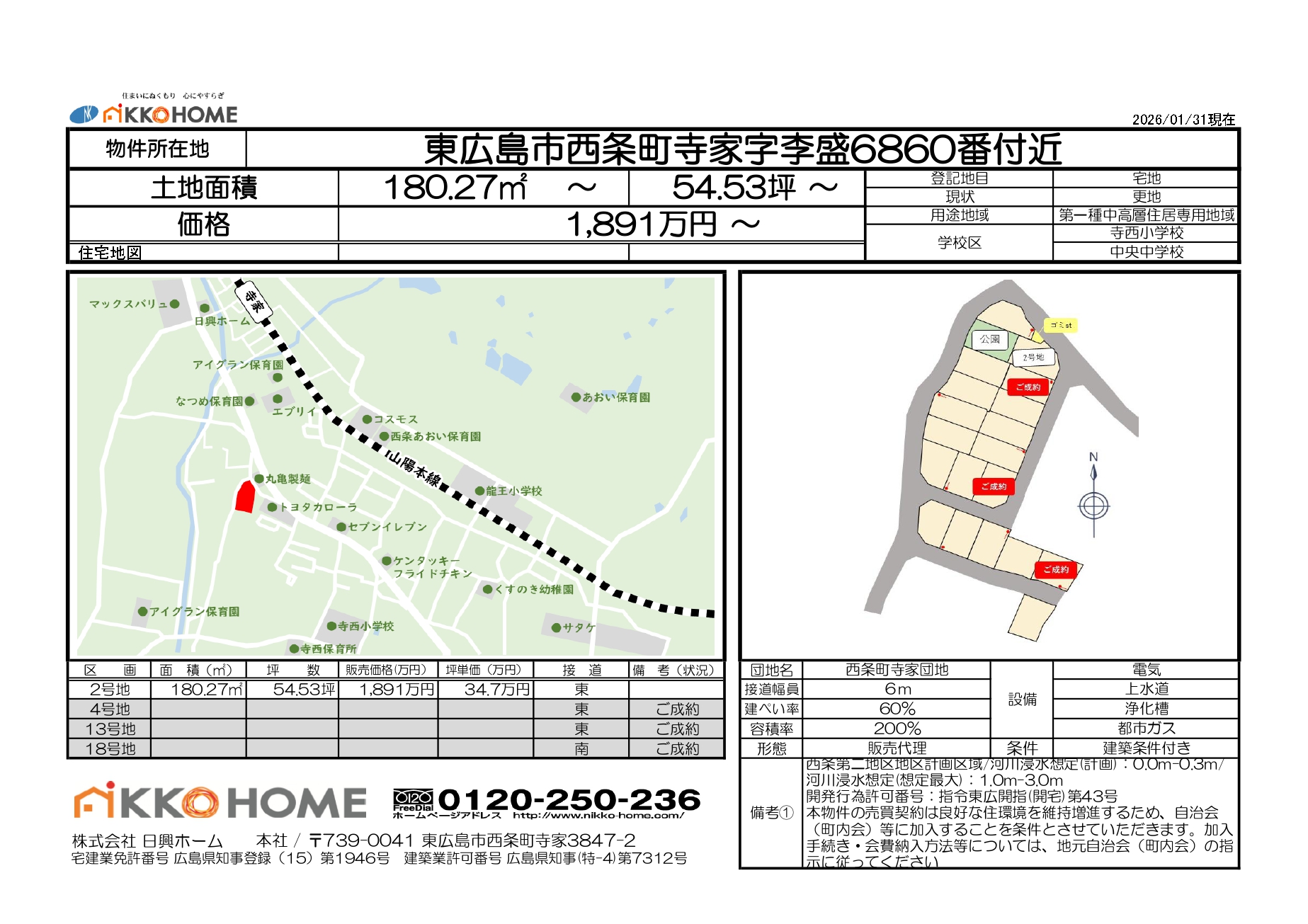 | 2号地 | 180.27㎡ | 54.53坪 | 1,891万円 | 34.7万円 |