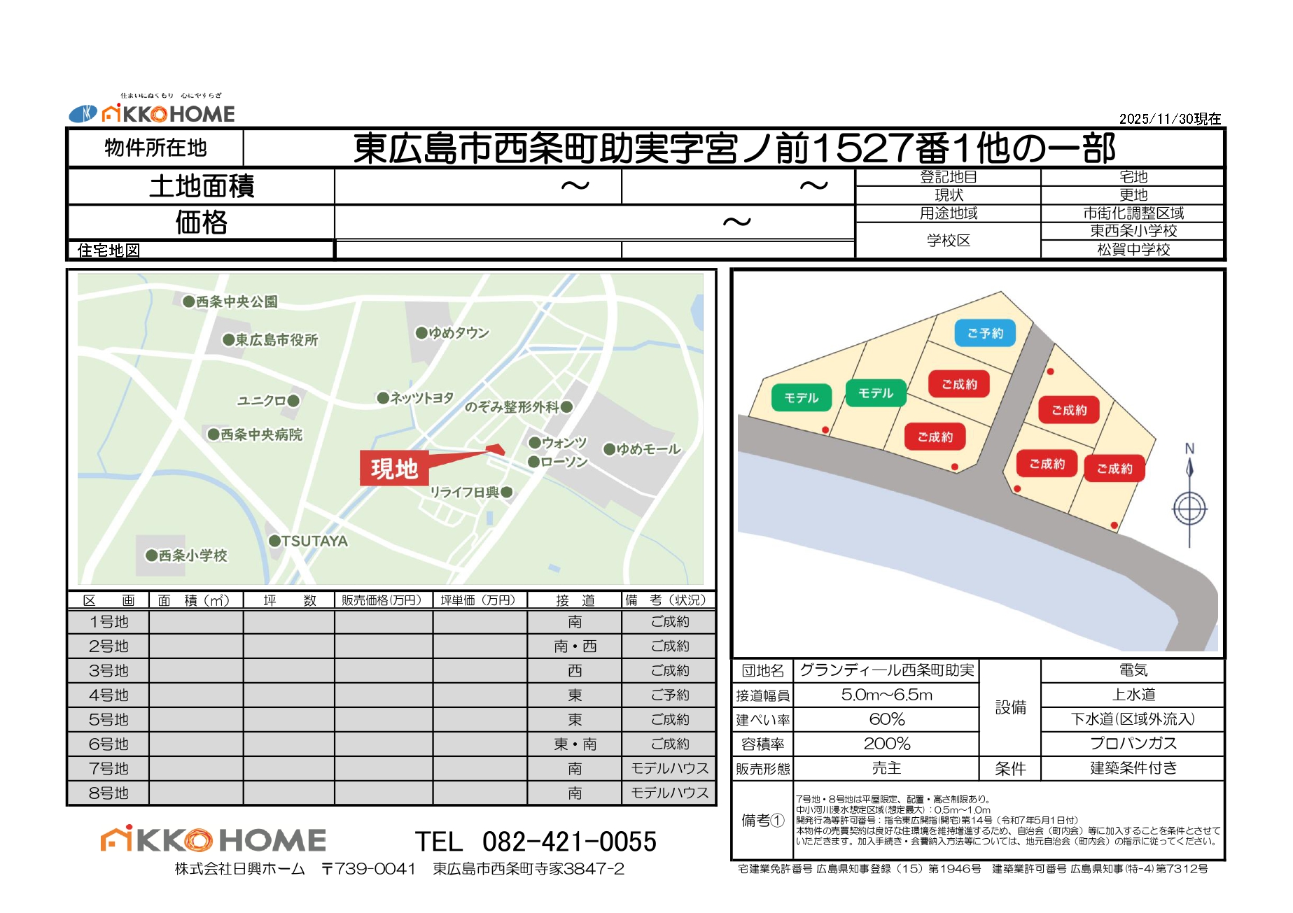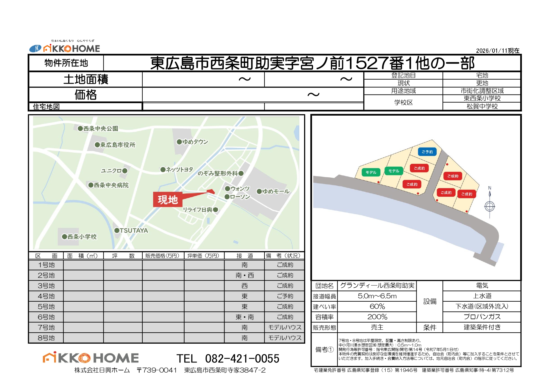 - 7号地・8号地は平屋限定、配置・高さ制限あり。 中小河川浸水想定区域(想定最大):0.5m~1.0m 開発行為等許可番号:指令東広開指(開宅)第14号(令和7年5月1日付)