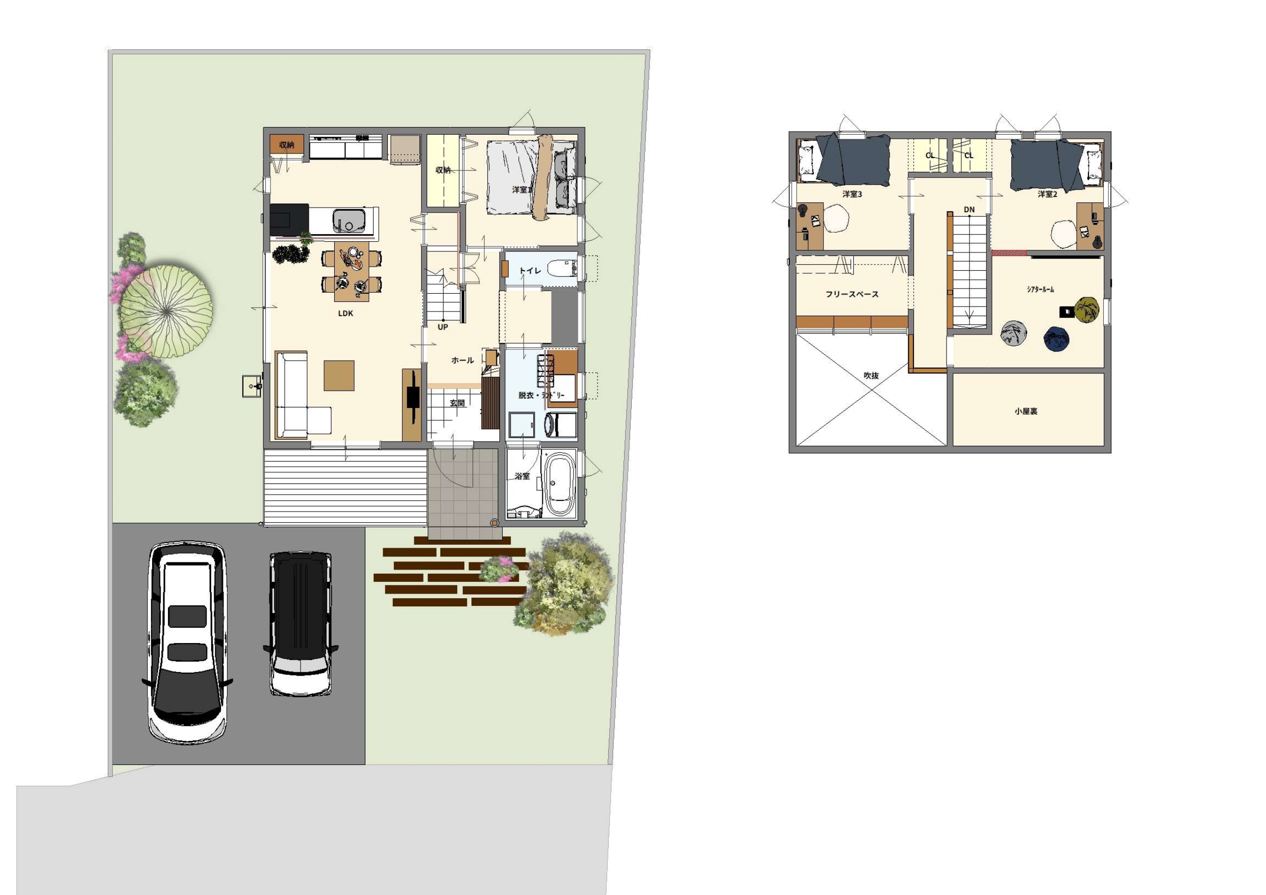 1階に主寝室を配置し、3LDK+秘密の部屋という贅沢な間取りです。