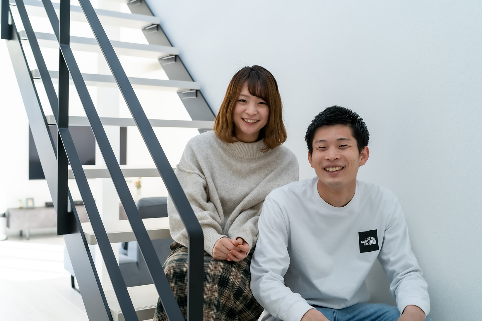 白と黒のコントラストが美しいスタイリッシュな印象の空間に、グレーが柔らかさを添えるK様邸。階段や室内ドアだけでなく、窓枠にも黒を採用して統一感を生み出すとともに、キッチンスペースの幅や、リビングダイニング(LD)のテレビまでの距離などを住宅展示場で測って参考にしつつ体感も交えてプランニングするなど、きめ細やかな工夫でイメージどおりの住まいを手に入れた。