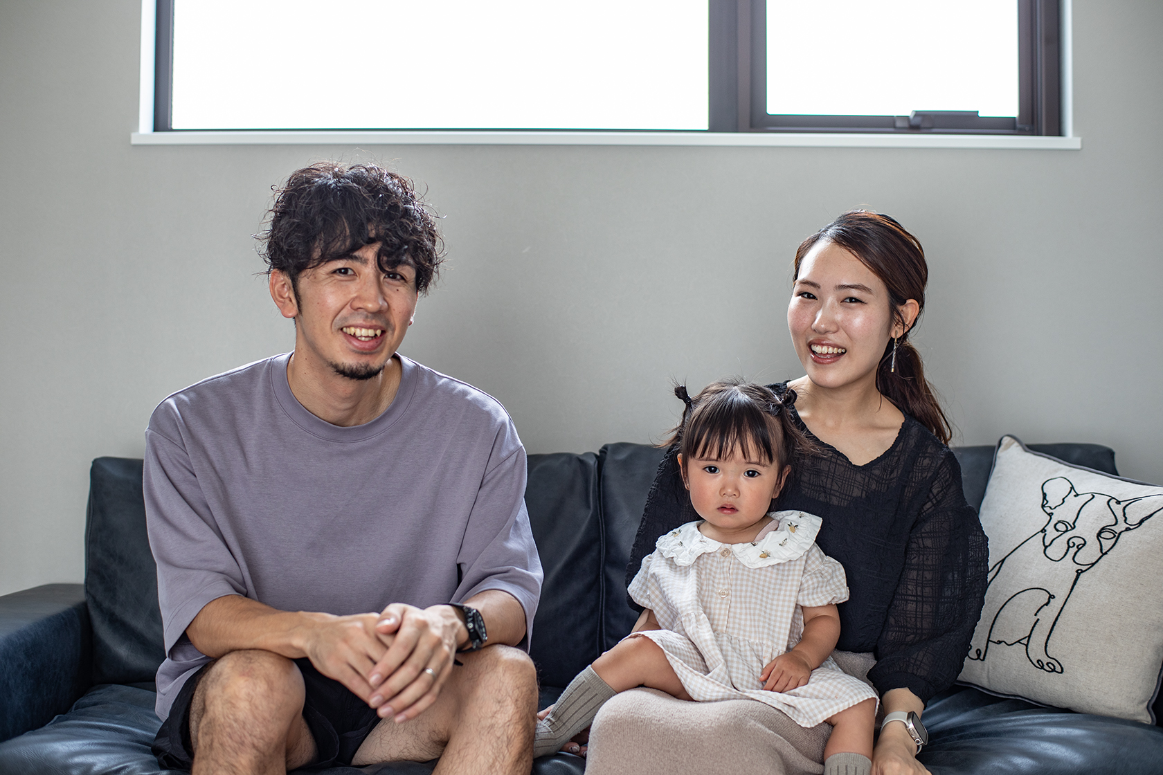 外観も室内も、グレーやアッシュブラックを基調にしたモノトーンの住まい。玄関を入るとその横には土間収納があり、アウトドアグッズが整然と並び、シンプルながらクールな雰囲気。結婚前に軽い気持ちで日興ホームのモデルハウスを見学したM様ご夫婦。その後、住まいへの夢が膨らみ「ずっと賃貸でいるより、早い段階で家を建てよう」と家づくりがスタートした。M様邸は日興ホームが採用するテクノストラクチャー工法を選択。耐震等級3の地震に強い、耐久性の高い木造の住まいだ。柱の少ない大きな空間を作ることが可能で広々としたLDKを実現できた。